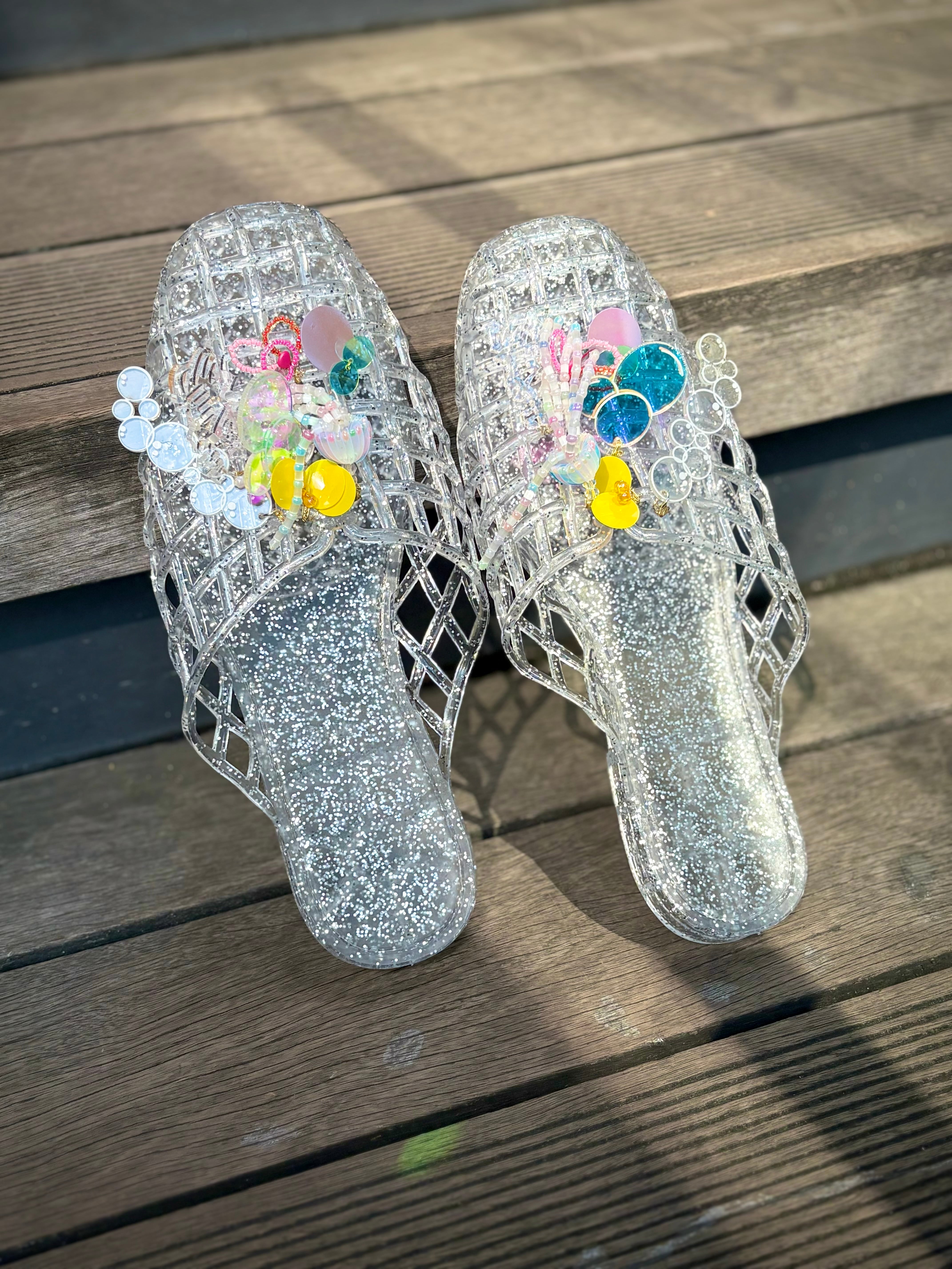 キラキラのラメサンダルに、クラゲやビーズ、そして主役の「銭湯」文字を贅沢にトッピングしました!